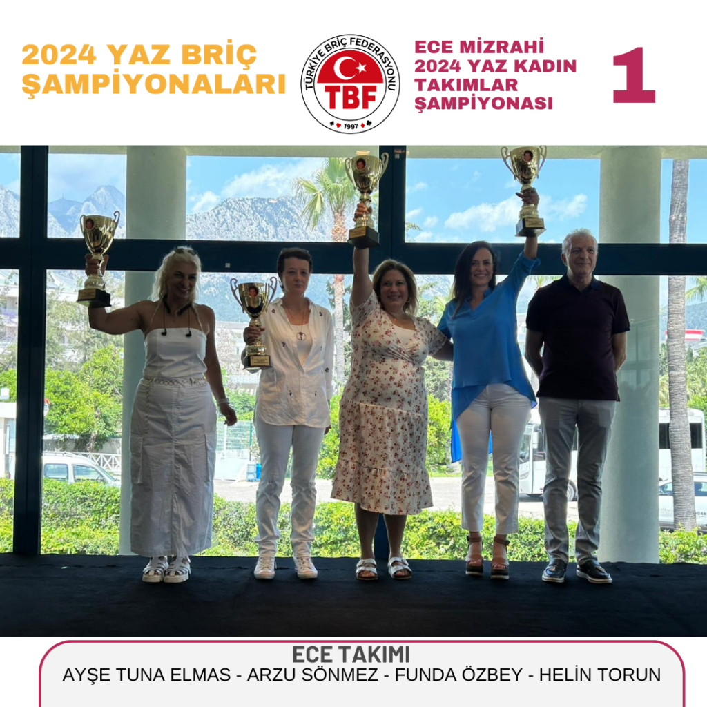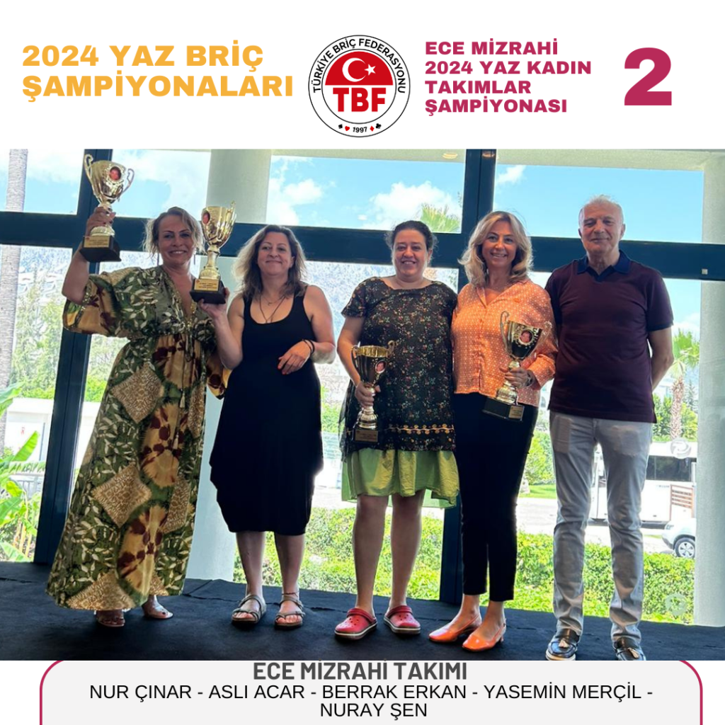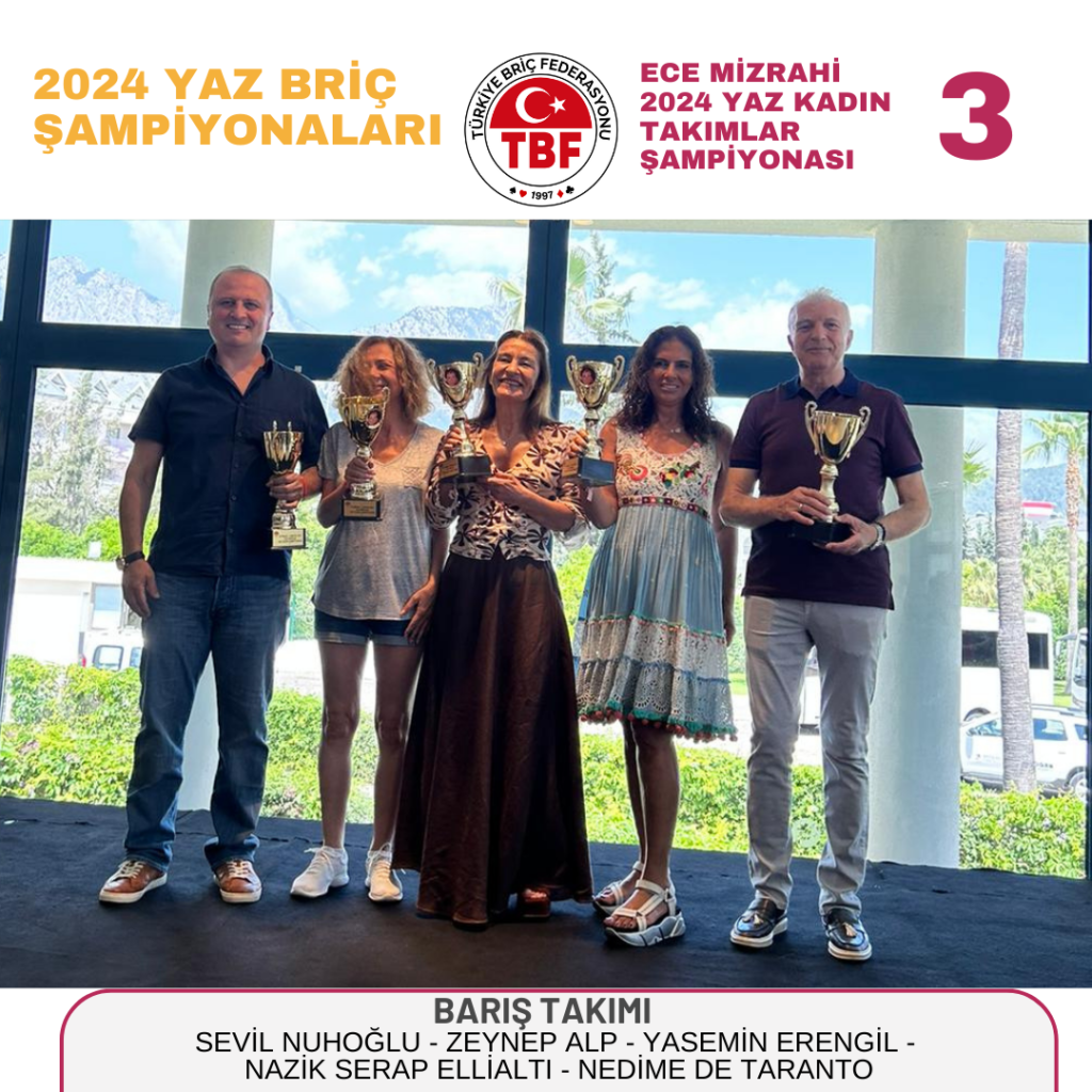 2024 Yaz Briç Şampiyonaları kapsamında gerçekleşen Ece Mizrahi 2024 Yaz Kadın Takımlar Şampiyonası’na katılan sporcularımıza ve emeği geçenlere teşekkür eder, dereceye giren sporcularımızı tebrik ederiz.